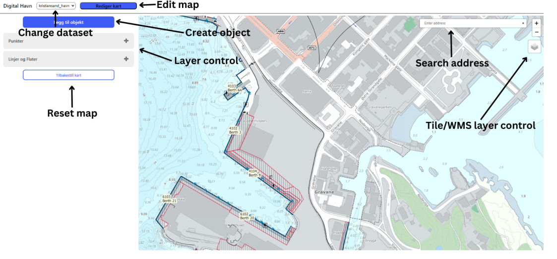 Høsten 2023 var QGIS og Port tilgjengelige verktøy for redigering av havnedata. QGIS var best egnet, men brukerterskelen var høy. Derfor var det behov for en enklere løsning for oppdatering. Målet som ble satt for arbeidspakke 1.2 var å utvikle en enkel webkartklient der brukere uten GIS-kompetanse kunne oppdatere havnedata. Klienten skulle: