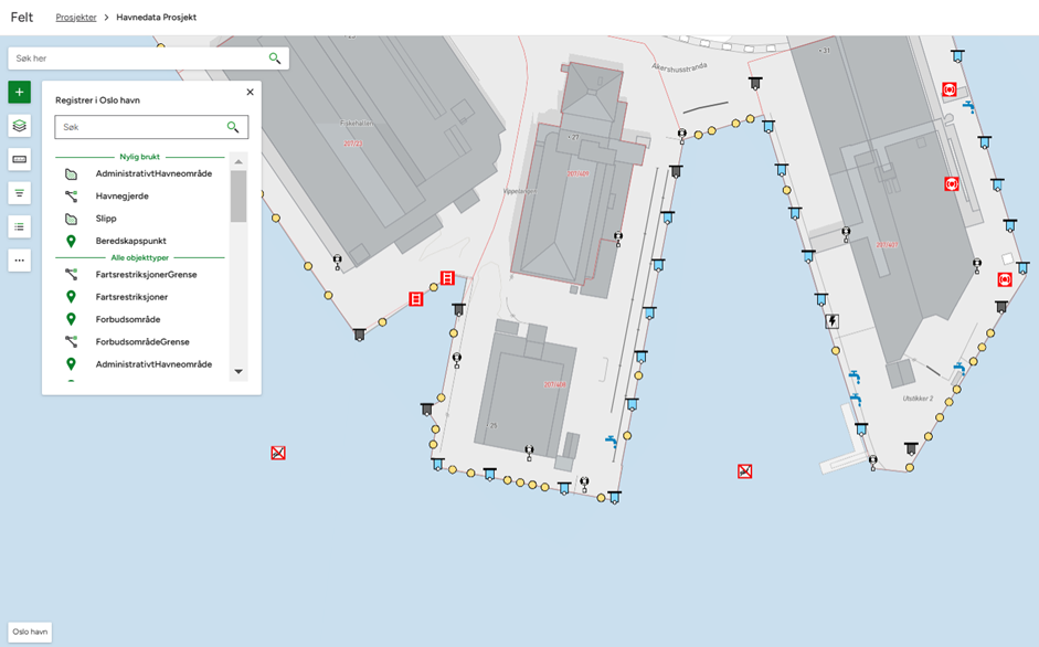 Skjermbilde: Visning av tilgjengelige havneobjekter, som kan